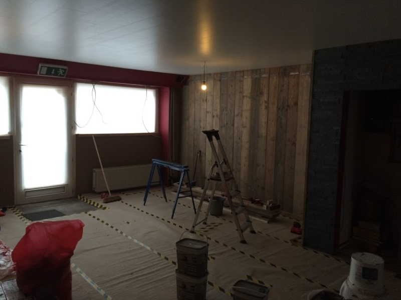 Plaatsen steigerhouten wand, vloer bekleedt met Meisterdesign pvc klikvloer, plafond verlaagd en geïsoleerd, verlichting en stopcontacten vernieuwd.